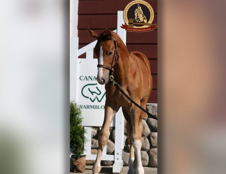 Receiving the high-selling 2-Year-Old Prospect cooler, sponsored by Key Warmbloods, was Diamond in the Sky (Diamond Stud x MJ Fusion), consigned and bred by Shirley England and purchased for $11,250 ($8,654 US) by Annespohie Canut of Foothills, Alberta.