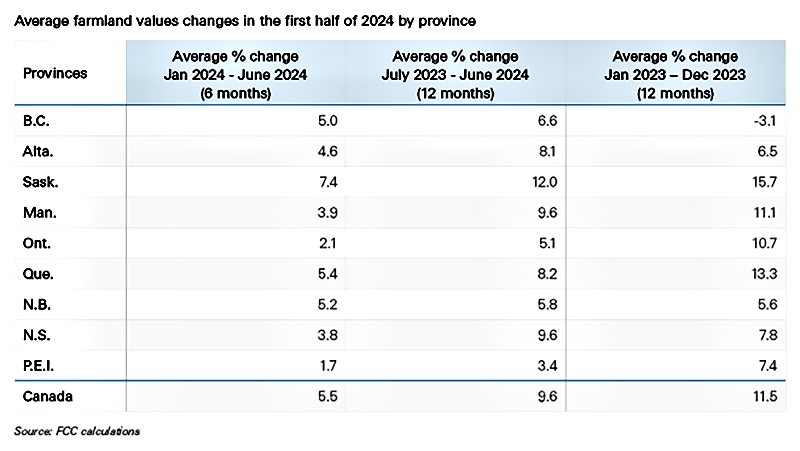 Regina, Saskatchewan, October 8, 2024 – Canadian cultivated farmland values rose by an average of 5.5 percent in the first half of 2024, according to the mid-year farmland values review by Farm Credit Canada (FCC). Over the 12 months from July 2023 to June 2024, there was a 9.6 percent increase, representing a slowdown compared to the previous 12-month period (January to December 2023).