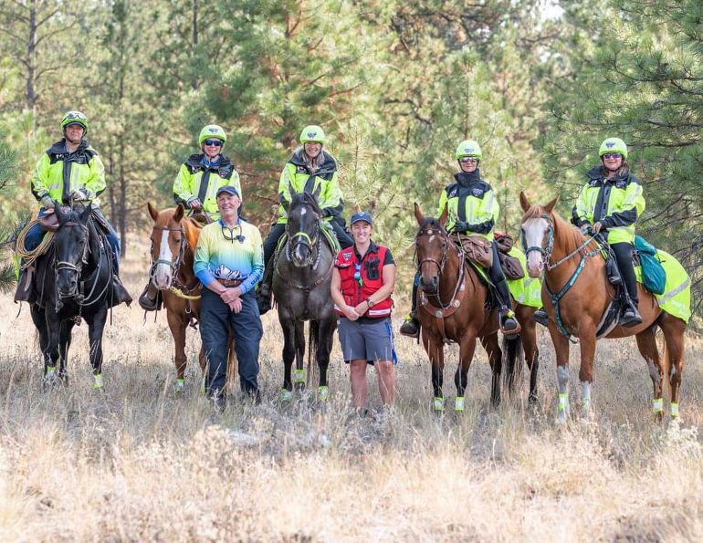 Main Photo: Cora riding Max, with instructors Katlyn (left) and Tiffany (right) on film day for TV. Courtesy of CanTRA.