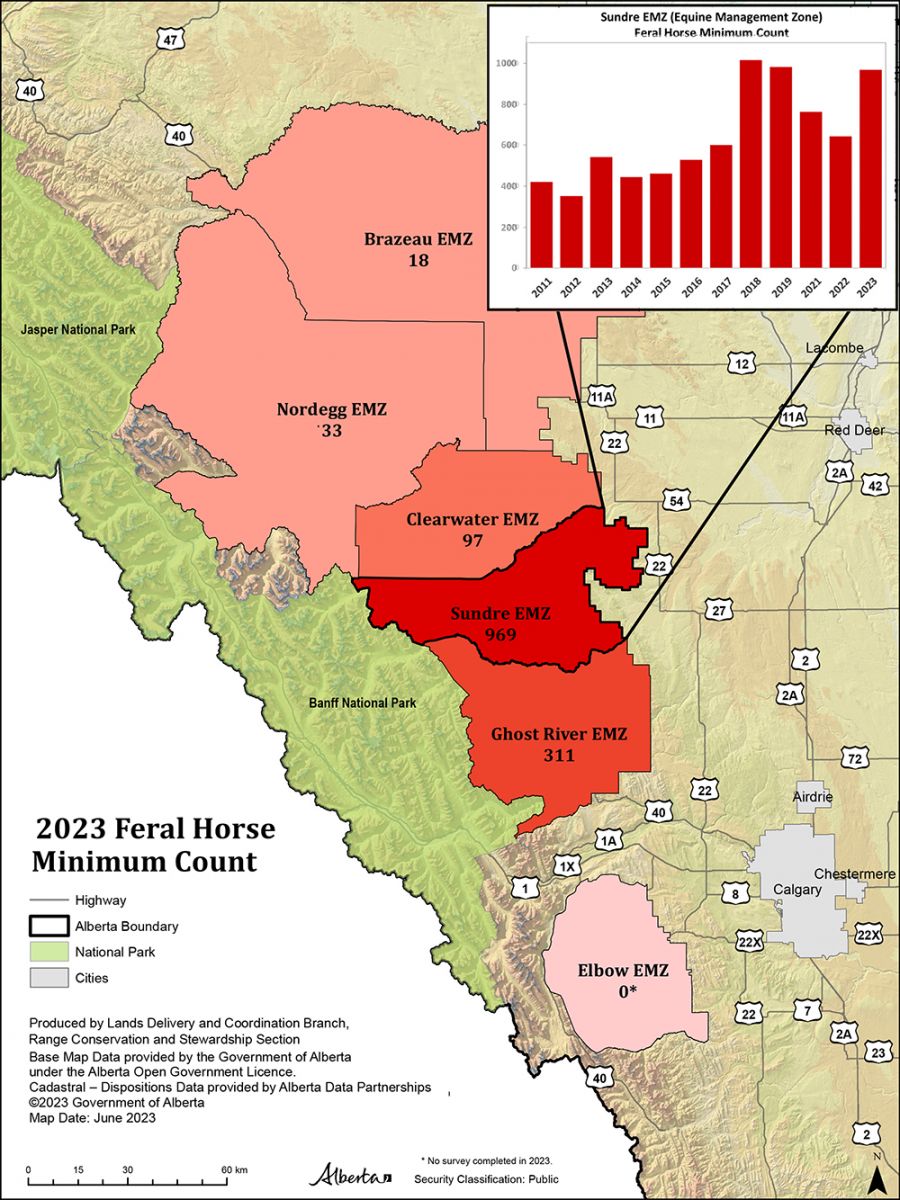 The feral horse counts within designated areas of Alberta provide a baseline of the minimum number of horses seen in preferred habitats. Shown are minimum counts for 2023. Summaries for previous years are found HERE.