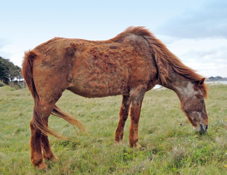 This problem presents itself in several ways. At first, Sophie has an irregular hind step. It feels as if the leg is not coming fully underneath her to complete the stride in the supportive phase. As the shoeing interval progresses, the stifle will occasionally hook and catch. It’s not quite a stumble step but it feels as though the leg gives out, especially on corners and tighter circles. The afflicted leg loses its ability to bend the hock. It does not come forward properly and instead just punches the ground, which throws the hip into the air and can almost unseat the rider.