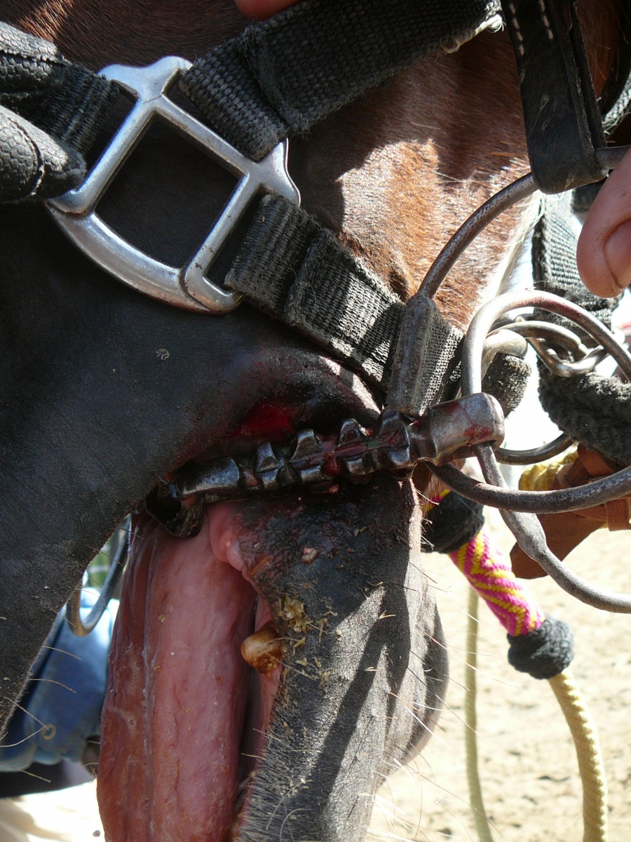 A handmade bit has caused injury and bleeding in this horse’s mouth. Photo: Caroline Moorey
