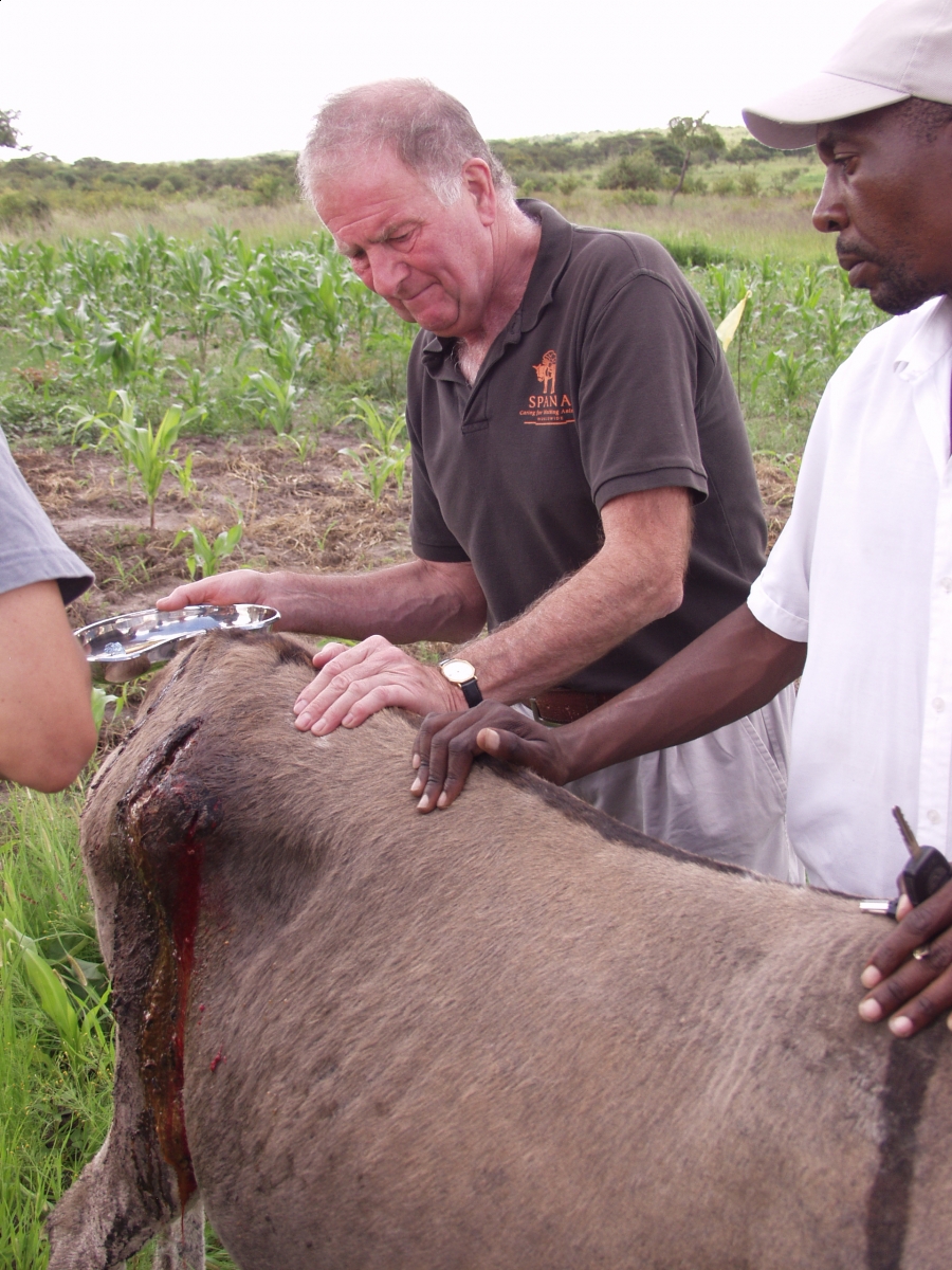 British Conservative MP Roger Gale assists with the veterinary treatment of a working donkey that had been attacked with an axe in Zimbabwe. The donkey was the innocent victim of a dispute over land, which is becoming an increasing problem as smallholders fight for land use rights. Roger Gale was the guest of UK veterinary charity SPANA, which supports the increasingly crucial role played by working animals in Zimbabwe. Photo: Courtesy of Simon Pope, SPANA