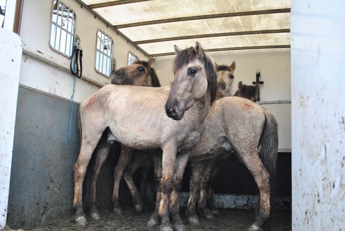 Konik horses on the move to a new home, where they will help conserve and restore natural wetlands with their grazing habits. Photo: Courtesy of Wildwood Trust