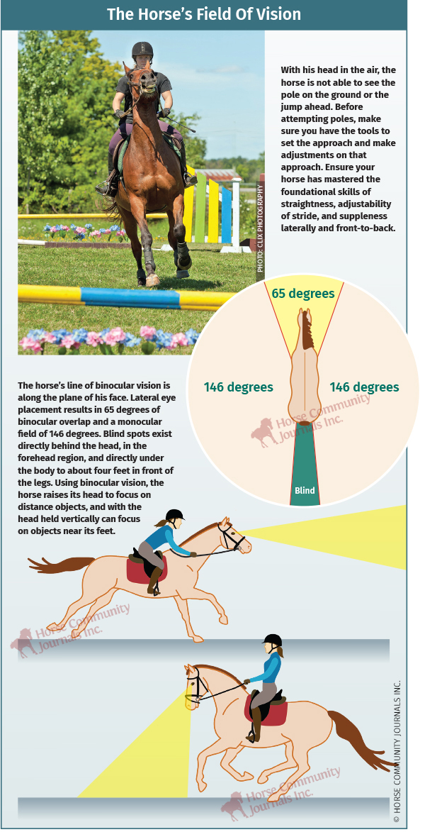 1. Master fundamentals before including poles. Don’t skip training steps. Nothing shakes a horse’s confidence like getting his feet tangled as he leaps over and lands on the rails. And no wonder — for a prey animal to have trapped feet is big trouble.