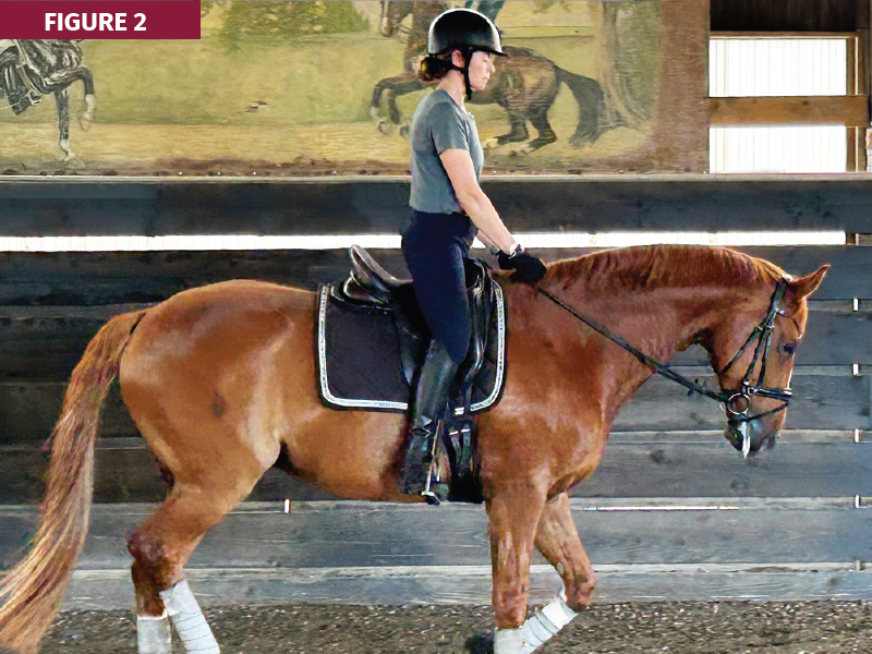 Eyeline refers to where the rider is looking. Eyeline “control” is the deliberate focus and ability of the rider to use focal points. This control improves spatial awareness and accuracy, allowing riders to indicate the direction of intended travel or line of the specific movement they are preparing to execute. When a rider looks down towards the horse’s neck, it causes tension in the rider’s neck, shoulders, and upper back. This creates a collapsed torso, puts the rider out of balance, decreases use of core muscles, and causes the legs to lose position. When the eyes are down, the head tips forward, resulting in the body automatically compensating to maintain balance and causing misalignment. An eyes-down and head-forward position also increases the weight on the front half of the horse’s body, especially their front feet, making it difficult for them to transfer weight onto the hind legs and move with freedom through their shoulders (see Figure 2).